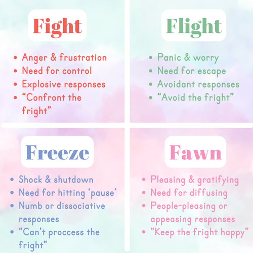 Triggers can be both positive and negative, and they aren’t always related to trauma, but when they are it is important to know that it is normal. Sometimes severe triggers can place a person into a fight/flight/freeze/fawn response, which dictates their behaviour and responses to what has triggered them.